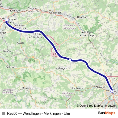 The first stop of the Re200 rail route is Ulm Hauptbahnhof and the last stop is Wendlingen (N). Re200 (Wendlingen - Merklingen - Ulm) is operational during everyday.