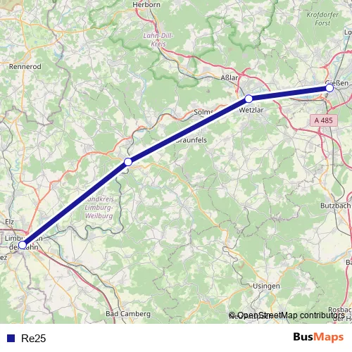 The first stop of the Re25 rail route is Gießen and the last stop is