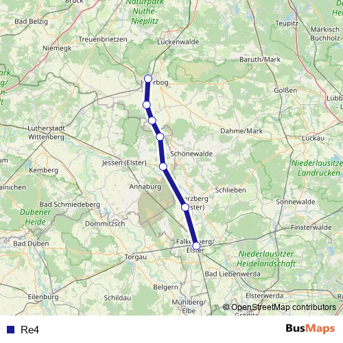 The first stop of the Re4 bus route is Falkenberg(Elster) and the last stop is Jüterbog. Re4 is operational during everyday.