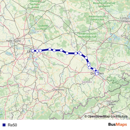 The first stop of the Re50 rail route is Leipzig Hbf and the last stop is Dresden Hbf. Re50 is operational during everyday.