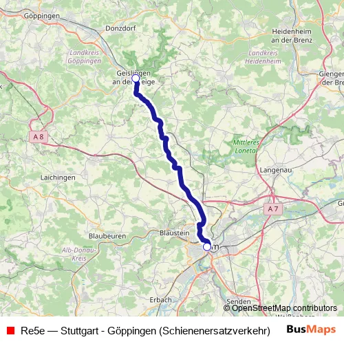 The first stop of the Re5e bus route is Geislingen (St) Zob and the last stop is Ulm Zob. Re5e (Stuttgart - Göppingen (Schienenersatzverkehr)) is operational during everyday.