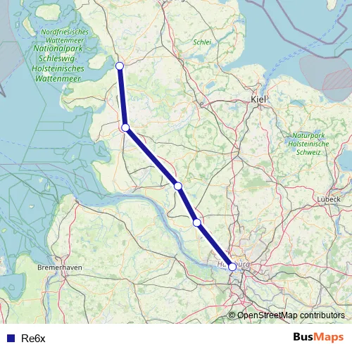 The first stop of the Re6x bus route is Husum, Bahnhof (Herzog-Adolf-Straße KBS), Mast 8r and the last stop is Bahnhof Altona, Hamburg. Re6x is operational during everyday.