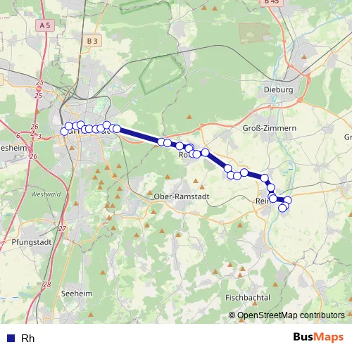 The first stop of the Rh bus route is Darmstadt Hauptbahnhof and the last stop is Reinheim-Ueberau Karl-Marx-Straße. Rh is operational during everyday.