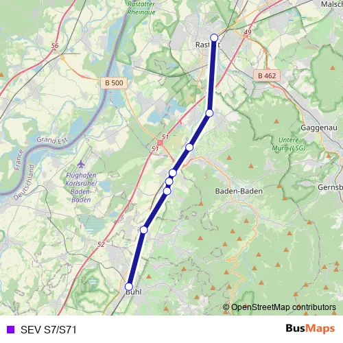 The first stop of the SEV S7/S71 bus route is Rastatt Bahnhof/Niederwaldstr. and the last stop is Baden-Baden Bahnhof. SEV S7/S71 is operational during everyday.