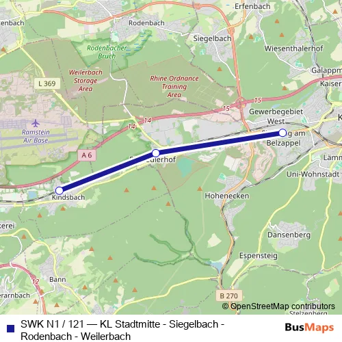 The first stop of the SWK N1 / 121 bus route is Kaiserslautern, Am Belzappel and the last stop is Kindsbach, Bahnhof. SWK N1 / 121 (KL Stadtmitte - Siegelbach - Rodenbach - Weilerbach) is operational during everyday.