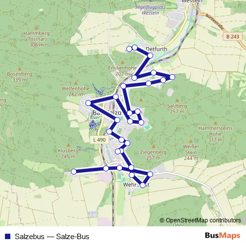 The first stop of the Salzebus bus route is Bad Salzdetfurth Maiental and the last stop is Bad Salzdetfurth Vitrea Rehaklinik. Salzebus (Salze-Bus) is operational during everyday.
