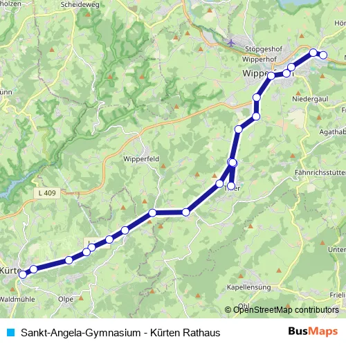 The first stop of the Sankt-Angela-Gymnasium - Kürten Rathaus tram route is Wipperfürth Sankt-Angela-Gymnasium and the last stop is