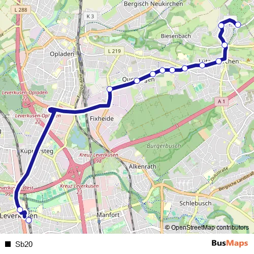 The first stop of the Sb20 bus route is Leverkusen Mitte Bf and the last stop is Leverkusen Forellental. Sb20 is operational during everyday.