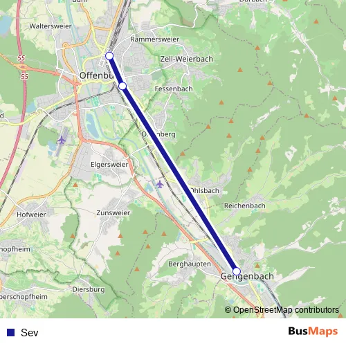 The first stop of the Sev rail route is Offenburg Bahnhof Ost and the last stop is Gengenbach. Sev is operational during everyday.