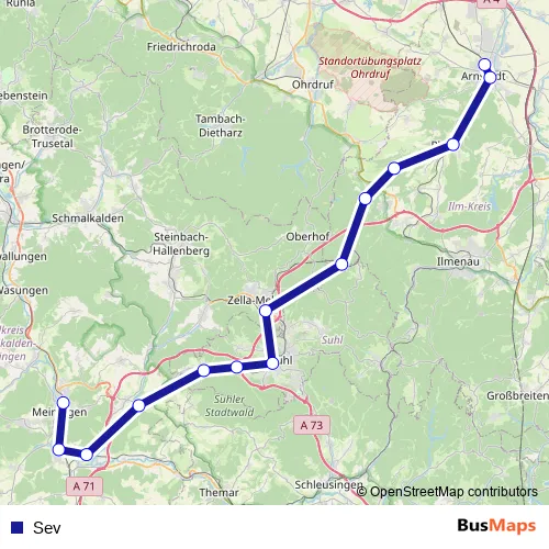 The first stop of the Sev bus route is Schmalkalden and the last stop is