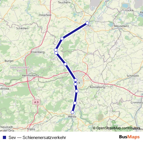 The first stop of the Sev bus route is Zeitz, Busbahnhof and the last stop is Weida. Sev (Schienenersatzverkehr) is operational during everyday.