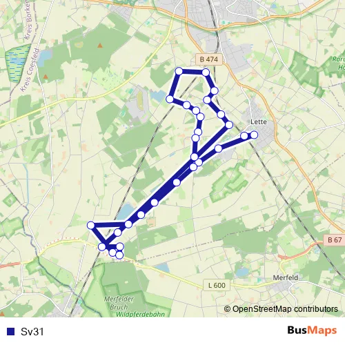 The first stop of the Sv31 bus route is Lette, Grundschule and the last stop is Letter Bruch, Campingplatz. Sv31 is operational during on weekdays.
