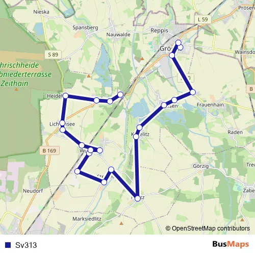 The first stop of the Sv313 bus route is Gröditz Am Kanal and the last stop is Tiefenau Bahnhof. Sv313 is operational during on weekdays.