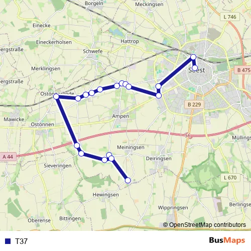 The first stop of the T37 bus route is Meiningsen, Meiningserbauer and the last stop is Soest, Bustreff Hansaplatz. T37 is operational during everyday.