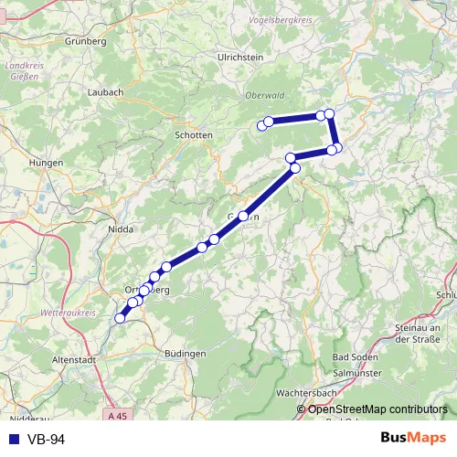 The first stop of the VB-94 bus route is Schotten-Breungeshain Hoherodskopf and the last stop is