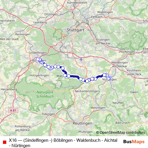 The first stop of the X16 bus route is Nürtingen Zob and the last stop is Böblingen Zob. X16 ((Sindelfingen -) Böblingen - Waldenbuch - Aichtal - Nürtingen) is operational during on weekdays.