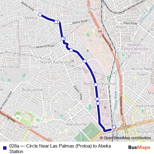 The first stop of the 028a bus route is Terminal Circle Near Las Palmas (Protoa) and the last stop is Terminal Abeka Station. 028a (Circle Near Las Palmas (Protoa) to Abeka Station) is operational during everyday.