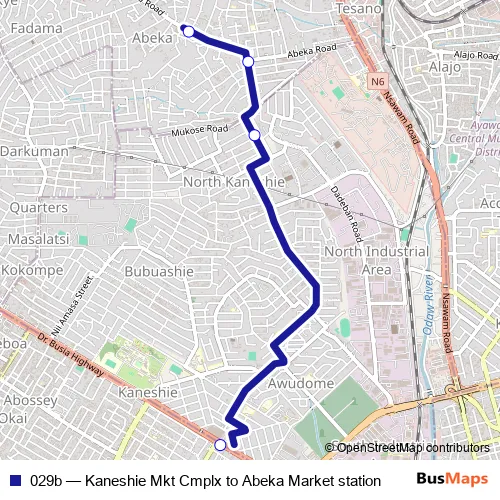 The first stop of the 029b bus route is Terminal Kaneshie Mkt Cmplx and the last stop is Terminal Abeka Market station. 029b (Kaneshie Mkt Cmplx to Abeka Market station) is operational during everyday.