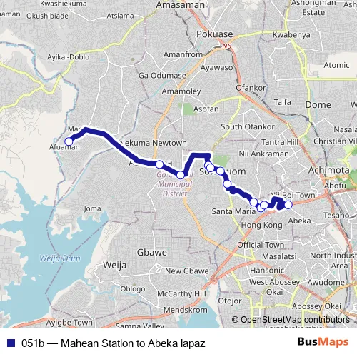 Services on the 051b - Mahean Station to Abeka lapaz bus stop at 17:06 on Monday, Tuesday, Wednesday, Thursday, Friday, Saturday, Sunday.