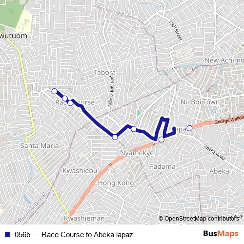The first stop of the 056b bus route is Terminal Race Course and the last stop is Terminal Abeka lapaz. 056b (Race Course to Abeka lapaz) is operational during everyday.