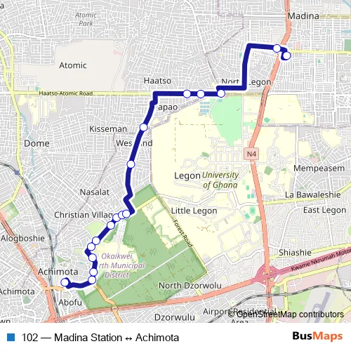 The first stop of the 102 bus route is Achimota New Station and the last stop is Madina. 102 (Madina Station ↔ Achimota) is operational during everyday.