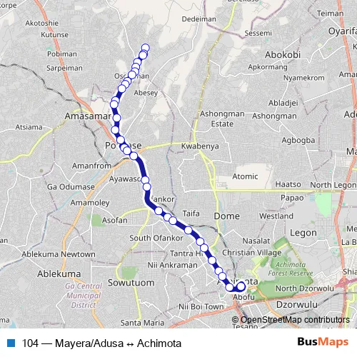 The first stop of the 104 bus route is Mayera/Adusa and the last stop is Achimota New Station. 104 (Mayera/Adusa ↔ Achimota) is operational during everyday.