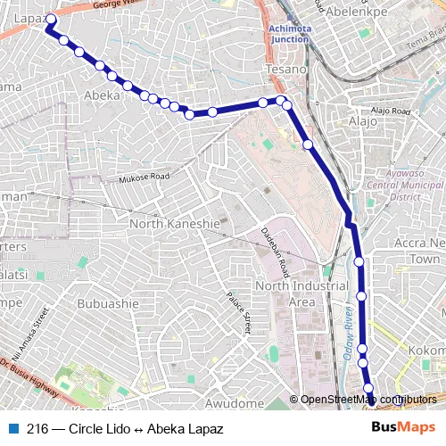 Bus 216 - Circle Lido ↔ Abeka Lapaz in Accra: Stops & Timetable
