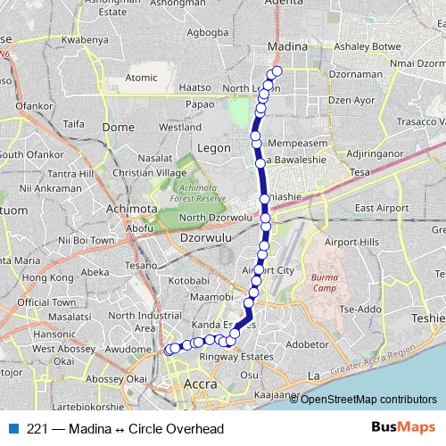 Bus 221 - Madina ↔ Circle Overhead Schedule in Accra
