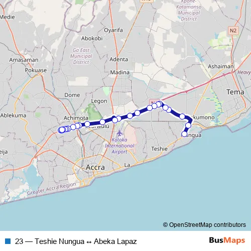 See why over 2 million users trust and consider busmaps.com as the best public transport website. busmaps gives you Accra Buses suggested routes, real-time bus tracker, line route maps in Accra, and helps to find the closest 23 bus stops near you. No internet available? Download an offline PDF map and bus schedule for the 23 bus to take on your trip.