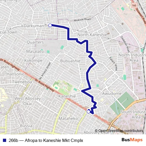 The first stop of the 266b bus route is Terminal Afropa and the last stop is Terminal Kaneshie Mkt Cmplx. 266b (Afropa to Kaneshie Mkt Cmplx) is operational during everyday.