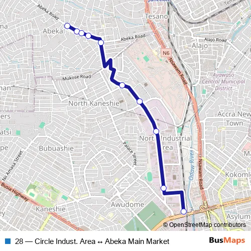 The first stop of the 28 bus route is Abeka Main Market and the last stop is Circle Industrial Area. 28 (Circle Indust. Area ↔ Abeka Main Market) is operational during everyday.