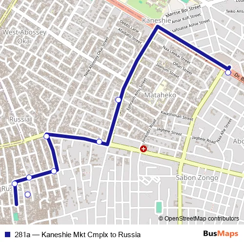 The first stop of the 281a bus route is Terminal Kaneshie Mkt Cmplx and the last stop is Terminal Russia. 281a (Kaneshie Mkt Cmplx to Russia) is operational during everyday.