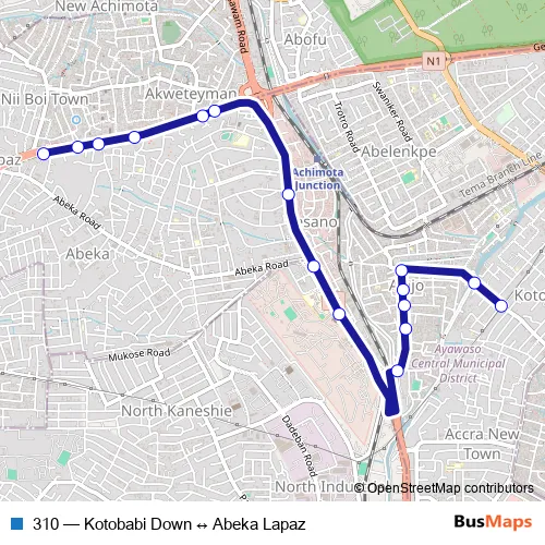 The first stop of the 310 bus route is Abeka Lapaz (Nii Boi) and the last stop is Kotobabi Down (Polo Park). 310 (Kotobabi Down ↔ Abeka Lapaz) is operational during everyday.