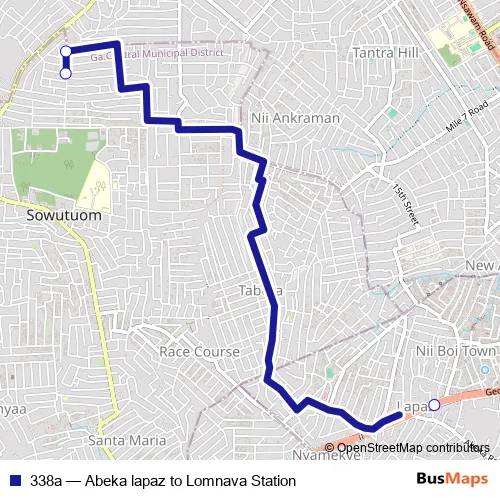 See why over 2 million users trust and consider busmaps.com as the best public transport website. busmaps gives you Accra Buses suggested routes, real-time bus tracker, line route maps in Accra, and helps to find the closest 338a bus stops near you. No internet available? Download an offline PDF map and bus schedule for the 338a bus to take on your trip.