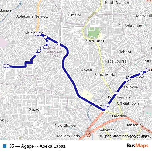 The first stop of the 35 bus route is Abeka Lapaz and the last stop is Agape. 35 (Agape ↔ Abeka Lapaz) is operational during everyday.