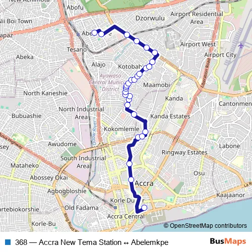 The first stop of the 368 bus route is Accra New Tema Station and the last stop is Abelenkpe. 368 (Accra New Tema Station ↔ Abelemkpe) is operational during everyday.
