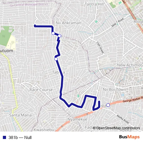 The first stop of the 381b bus route is Aforman house and the last stop is Terminal Abeka lapaz. 381b (Null) is operational during everyday.