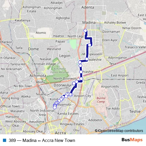The first stop of the 389 bus route is Madina and the last stop is Accra New Town (37 Station). 389 (Madina ↔ Accra New Town) is operational during everyday.