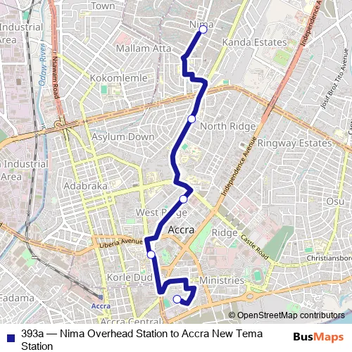 The first stop of the 393a bus route is Terminal Nima Overhead Station and the last stop is Terminal Accra New Tema Station. 393a (Nima Overhead Station to Accra New Tema Station) is operational during everyday.