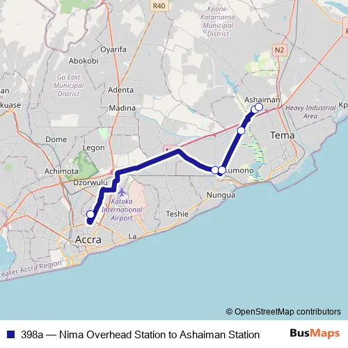 The first stop of the 398a bus route is Terminal Nima Overhead Station and the last stop is Terminal Ashaiman Station. 398a (Nima Overhead Station to Ashaiman Station) is operational during everyday.