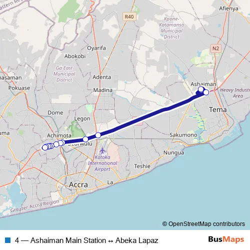 The first stop of the 4 bus route is Ashaiman and the last stop is Abeka Lapaz. 4 (Ashaiman Main Station ↔ Abeka Lapaz) is operational during everyday.