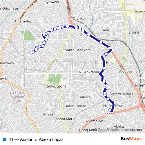The first stop of the 41 bus route is Abeka Lapaz and the last stop is Asofan New Station. 41 (Asofan ↔ Abeka Lapaz) is operational during everyday.