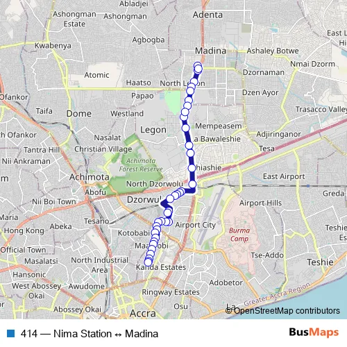 See why over 2 million users trust and consider busmaps.com as the best public transport website. busmaps gives you Accra Buses suggested routes, real-time bus tracker, line route maps in Accra, and helps to find the closest 414 bus stops near you. No internet available? Download an offline PDF map and bus schedule for the 414 bus to take on your trip.