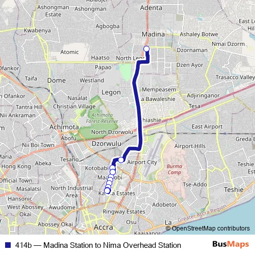 The first stop of the 414b bus route is Terminal Madina Station and the last stop is Maamobi Market. 414b (Madina Station to Nima Overhead Station) is operational during everyday.