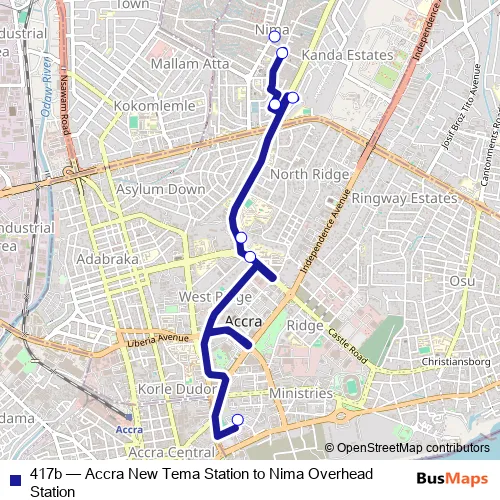 The first stop of the 417b bus route is Terminal Accra New Tema Station and the last stop is Terminal Nima Overhead Station. 417b (Accra New Tema Station to Nima Overhead Station) is operational during everyday.