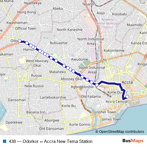 The first stop of the 438 bus route is Accra New Tema Station and the last stop is Odorkor. 438 (Odorkor ↔ Accra New Tema Station) is operational during everyday.