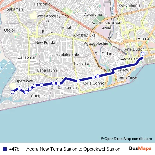 The first stop of the 447b bus route is Terminal Accra New Tema Station and the last stop is Terminal Opetekwei Station. 447b (Accra New Tema Station to Opetekwei Station) is operational during everyday.