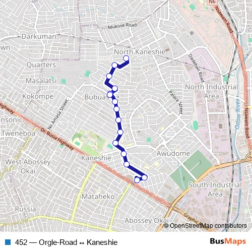 The first stop of the 452 bus route is Orgle-Road and the last stop is Kaneshie Market Station. 452 (Orgle-Road ↔ Kaneshie) is operational during everyday.