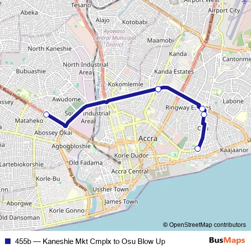 The first stop of the 455b bus route is Terminal Kaneshie Mkt Cmplx and the last stop is Mobil 055. 455b (Kaneshie Mkt Cmplx to Osu Blow Up) is operational during everyday.