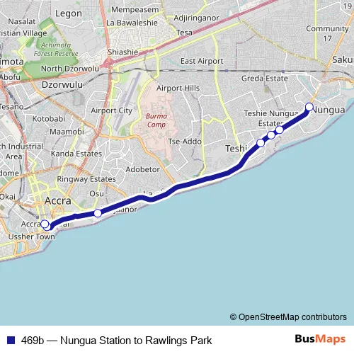 The first stop of the 469b bus route is Terminal Nungua Station and the last stop is Terminal Rawlings Park. 469b (Nungua Station to Rawlings Park) is operational during everyday.